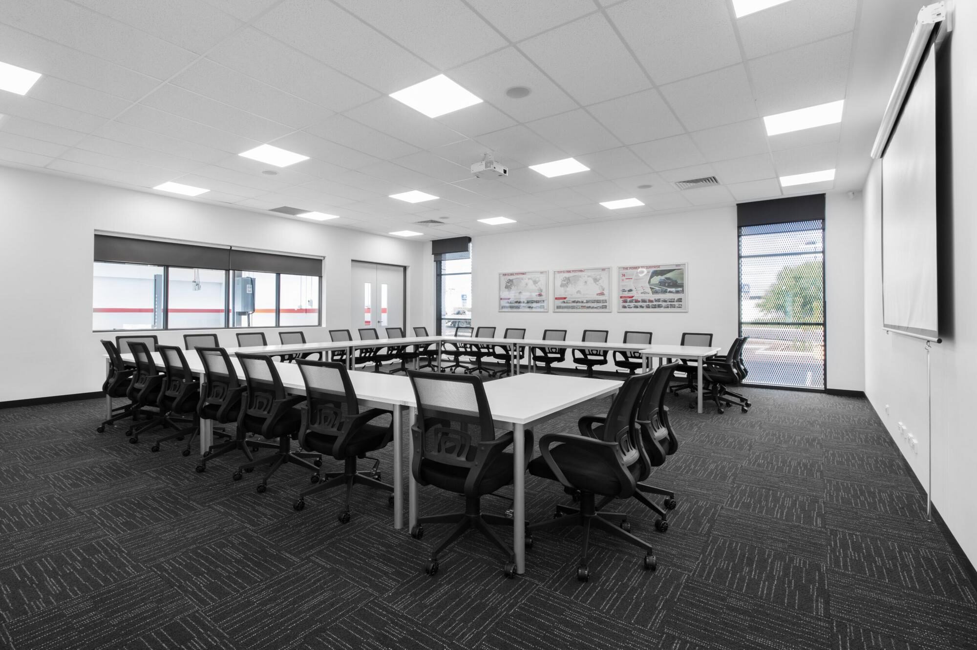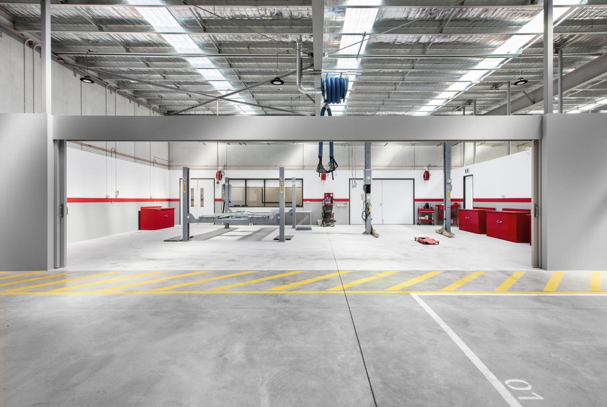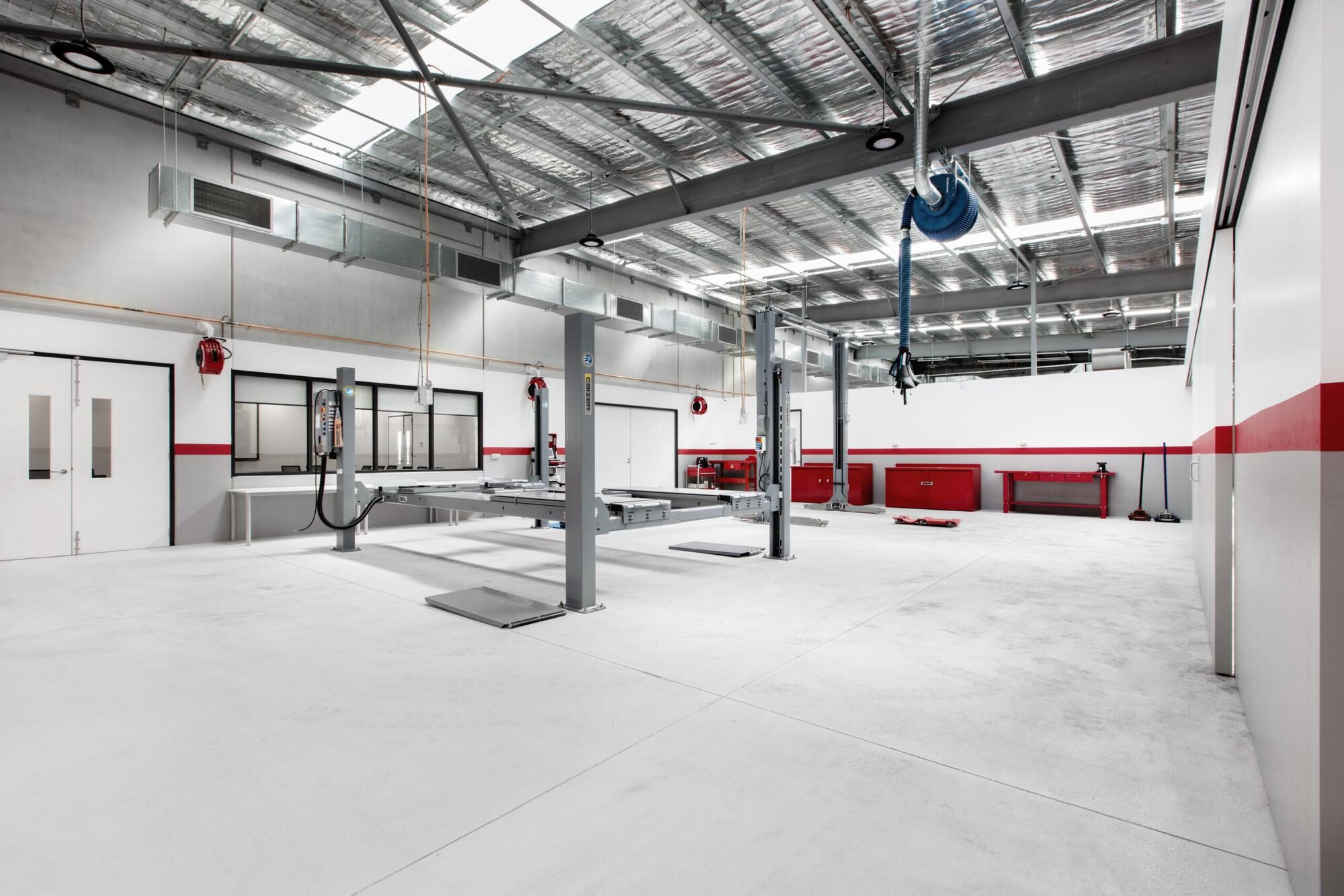 The one-level building comprises an office with work stations, a boardroom, meeting rooms, and staff amenities, a training facility, a work bay area, and car storage with external car parking.